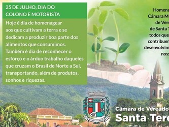 Parabéns ! É com imensa alegria que a Câmara Municipal de Vereadores de Santa Tereza parabeniza todos os Colonos e Motoristas pela passagem de seu dia neste 25 de Julho.