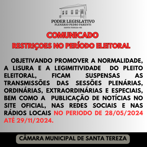 Quatro projetos de lei estão em pauta e serão votados pelos vereadores de Santa Tereza nesta terça-feira, dia 09 de abril.
