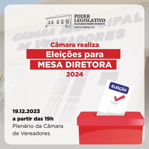 Um total de duas chapas foram inscritas para a eleição da Mesa Diretora da Câmara Municipal de Santa Tereza, que ocorrerá na noite desta terça-feira, 19 de dezembro, a partir das 19h.