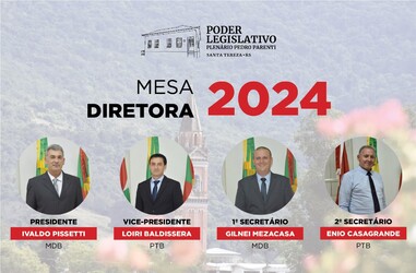 O vereador Ivaldo Pissetti (MDB) assumiu como Presidente para a gestão 2024, tendo Loiri Baldissera(PTB) como vice-presidente; Gilnei Mezacasa (MDB) o primeiro Secretário; e Enio Antonio Casagrande (PTB) o segundo Secretário.